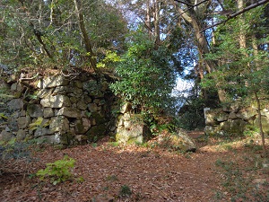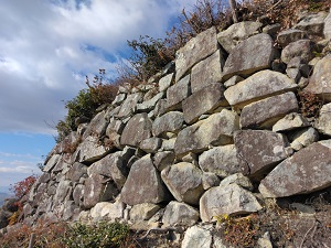 観音寺城の本丸は、繖山の山上の標高は395mにあります。遺構として、石垣、食い違い虎口、大手石階段、暗渠排水跡などが確認できます。